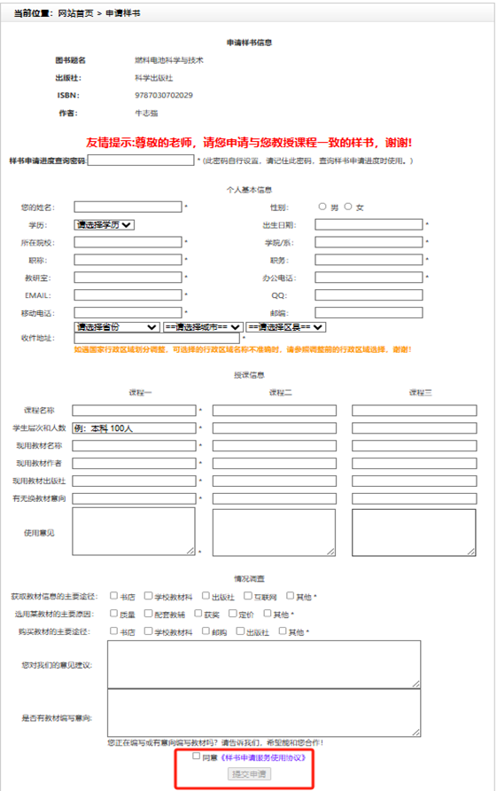 樣書申請信息表如下圖: