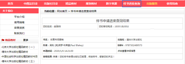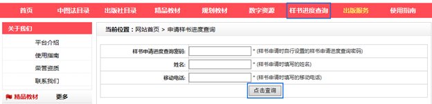 3.樣書申請進(jìn)度查詢 點(diǎn)擊導(dǎo)航欄下的樣書進(jìn)度查詢,輸入樣書申請時填寫的樣書申請進(jìn)度查詢密碼、姓名以及移動電話,可以查詢樣書申請出版社審核情況等。