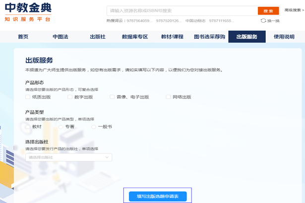 5. 出版服務(wù) 點(diǎn)擊導(dǎo)航欄下的出版服務(wù),即可跳轉(zhuǎn)中教金典知識服務(wù)平臺(https://www.zjjd.cn/)出版服務(wù)專區(qū)。 本頻道為廣大師生提供出版服務(wù),如有出版需求,可填寫出版選題申請表,以便對接出版服務(wù)。