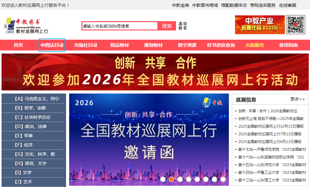 教材巡展網(wǎng)上行使用說明 任課教師通過登陸中教圖書(www.book1993.com),點(diǎn)擊教材巡展網(wǎng)上行進(jìn)入“教材巡展網(wǎng)上行”平臺(也可直接通過網(wǎng)址http//www.jcxzwsx.com登陸進(jìn)入“教材巡展網(wǎng)上行”平臺),即可進(jìn)行教材的搜索、選擇。另外,平臺還為任課教師提供與出版社之間的樣書選贈互動服務(wù),任課教師可在網(wǎng)上向參加教材巡展并提供樣書贈送服務(wù)的出版社申請樣書,出版社相關(guān)人員登陸網(wǎng)站后臺下載任課教師填報的樣書需求信息以及出版意向信息,并將處理結(jié)果適時反饋任課教師。 1.查找教材方式 方式一 點(diǎn)擊中圖法目錄查找。如下圖: