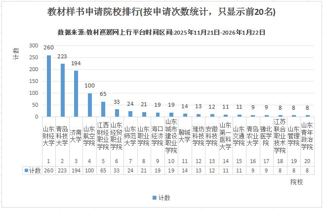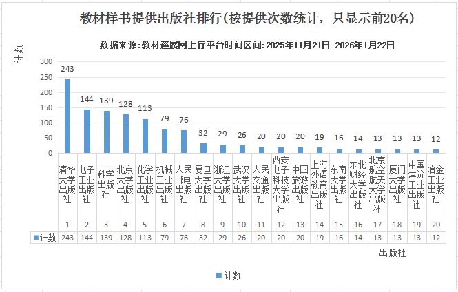2025年11月21日,“2026全國教材巡展網(wǎng)上行”正式拉開帷幕。 本活動依托于“教材巡展網(wǎng)上行”(www.jcxzwsx.com)服務平臺,聯(lián)合科學出版社、清華大學出版社、北京大學出版社、電子工業(yè)出版社、化學工業(yè)出版社、機械工業(yè)出版社、人民郵電出版社、人民交通出版社、上海外語教育出版社、外語教學與研究出版社、中國建筑工業(yè)出版社、國防工業(yè)出版社等170家以教材出版為主的出版社,并得到了學校教材管理服務部門的大力支持,打造出一條連接出版社和各學科任課老師的教材信息交流通道,為各學科任課老師的教材選用、教材樣書免費申請、自編教材的出版等方面提供優(yōu)質(zhì)的服務。 為了滿足學校和出版社的要求,從2025年11月21日開始我們定時播報教材巡展網(wǎng)上行的各類數(shù)據(jù)統(tǒng)計,并保證數(shù)據(jù)的真實性和有效性。 截止到2026年1月22日8時(統(tǒng)計區(qū)間:2025年11月21日0時-2026年1月22日8時) 訪問/展示數(shù)據(jù):