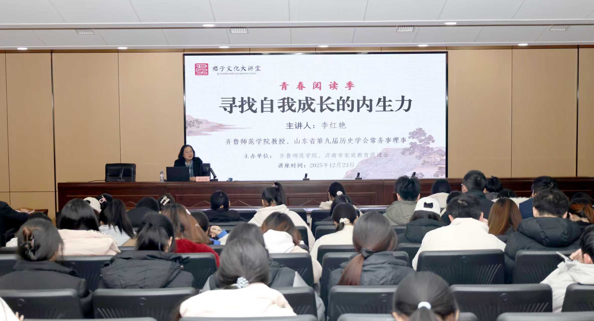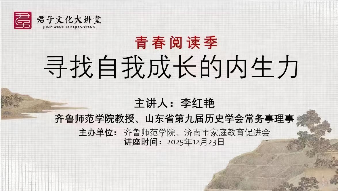 12月23日,“君子文化大講堂・青春閱讀季”之“經(jīng)典閱讀:尋找自我成長的內(nèi)生力”主題講座在齊魯師范學院成功舉辦。本次講座由齊魯師范學院、濟南市家庭教育促進會聯(lián)合主辦,山東中教產(chǎn)業(yè)發(fā)展股份有限公司(簡稱“中教產(chǎn)業(yè)”)作為促進會發(fā)起單位,深度參與活動籌備與落地,以教育資源賦能經(jīng)典傳播,為廣大師生奉上一場兼具文化厚度與實踐價值的閱讀盛宴。齊魯師范學院教授、山東省第九屆歷史學會常務理事李紅艷受邀擔任主講人。